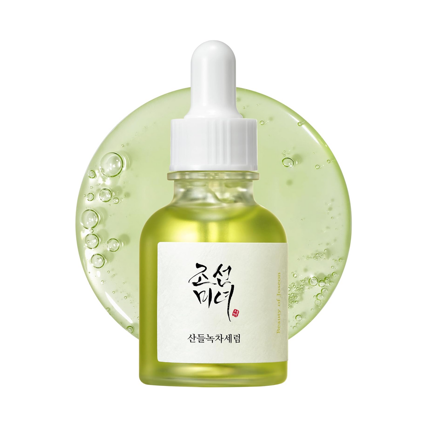 Beauty of Joseon's Calming Serum: Green Tea + Panthenol is a soothing serum formulated with 50% green tea leaf water, 30% mugwort extract, and 5% panthenol. This blend calms sensitive skin, reduces redness, and strengthens the skin barrier, promoting a healthier complexion.